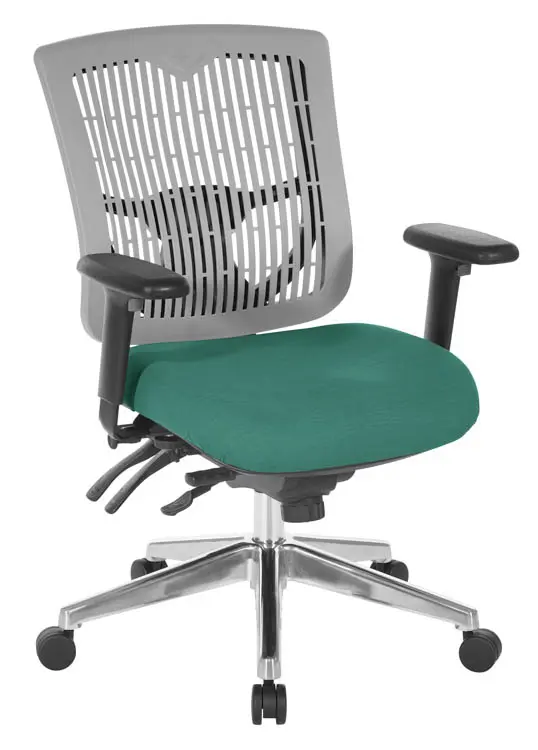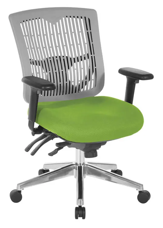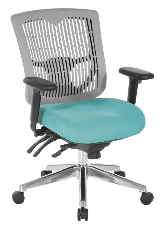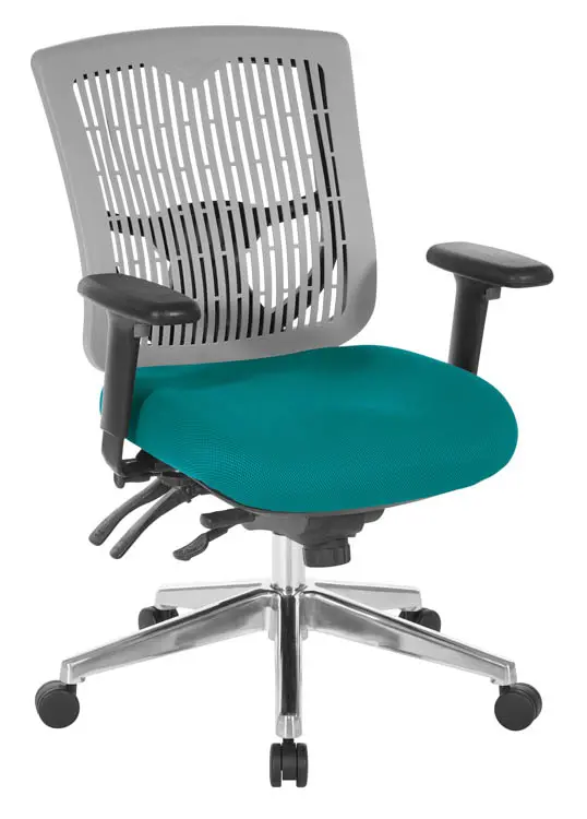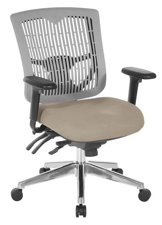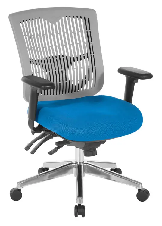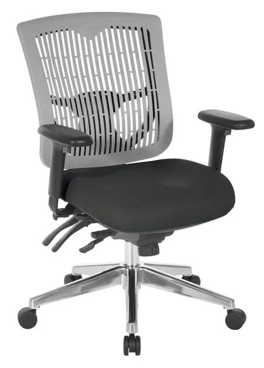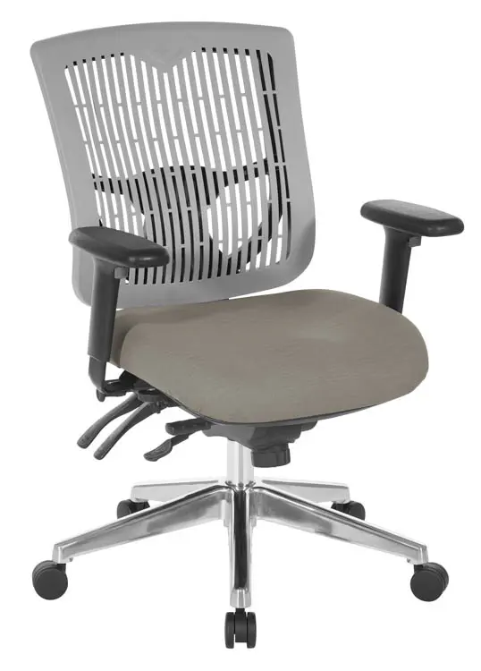 Contoured Plastic Grey Back Manager Chair with Adjustable Arms, Rachet Back, Fabric Seat, Dual Wheel Carpet Casters, and Polished Aluminum Base.