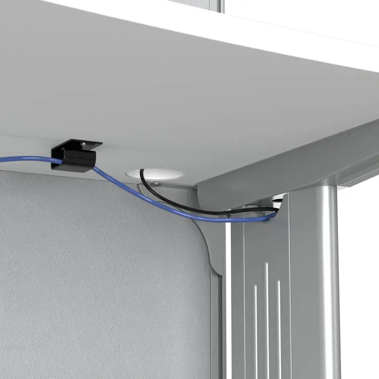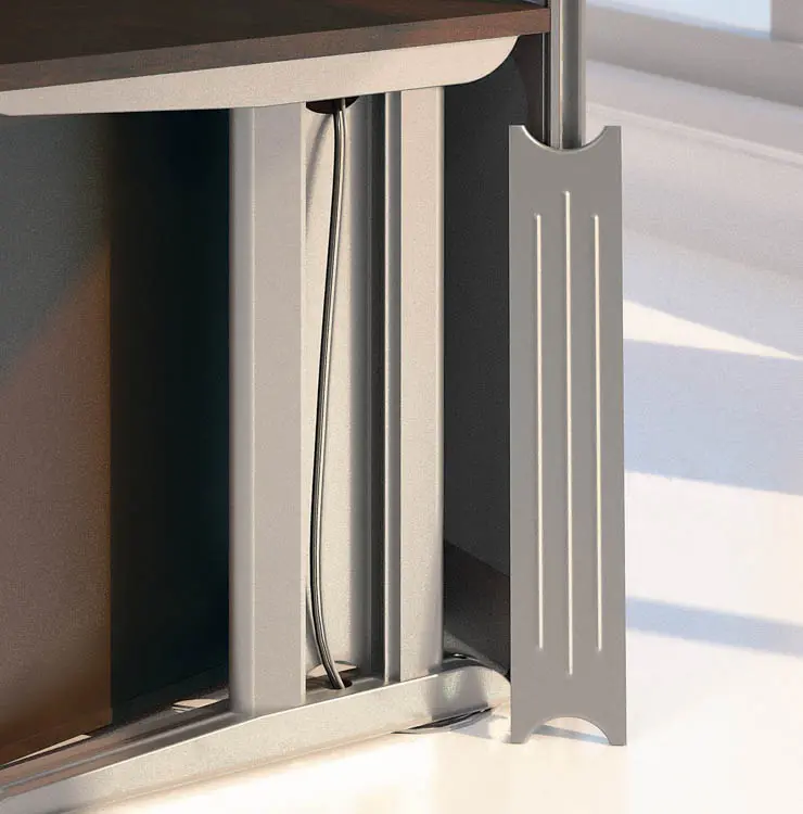 A convenient cable management system features desktop grommets and removable panels in the metal legs for organizing cords.