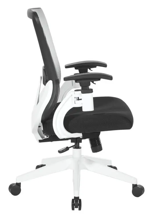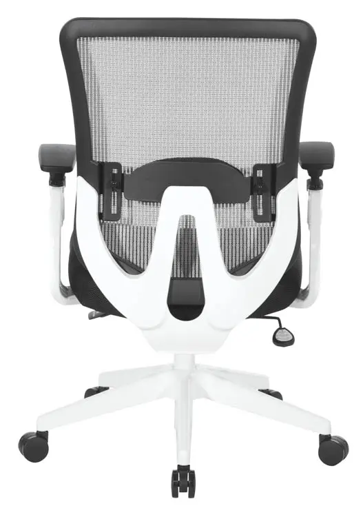 • White Vertical Mesh High Back Chair with Height Adjustable Lumbar Support, Linen Fabric Seat, Height Adjustable Padded Arms, and White Angled Nylon Base