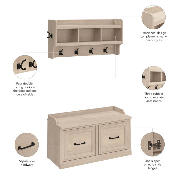 The shoe bench and wall mounted shelf's transitional design blends elements of contemporary and traditional styling to complement a wide range of home furnishings while your choice of several attractive finish options make it easy to find the perfect look for your space.