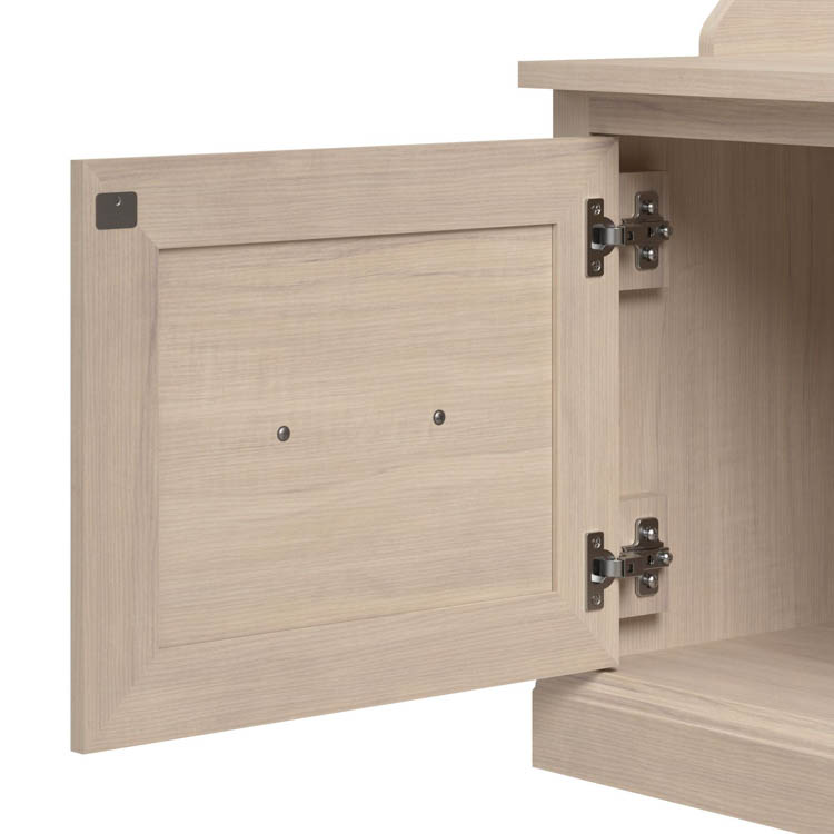 • Cabinet doors with Euro-style hinges open to reveal two compartments for storing footwear and accessories