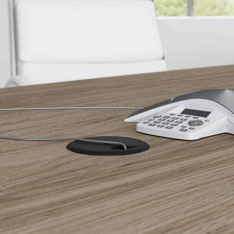 The tabletop also includes two wire management grommets to accommodate cords and cables from a projector or speaker phone.
