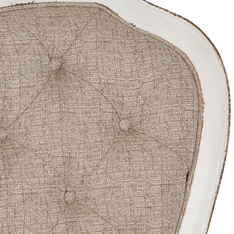 Crafted of rubberwood solids, this piece features an adjustable seat height, dual wheel casters and is upholstered in ivory tufted chenille with white and brown threading throughout.