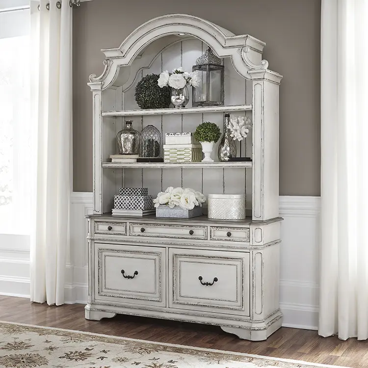 • Credenza Features two large file drawers and three fully stained full extension drawers accented by antique pewter bail pull and knob hardware