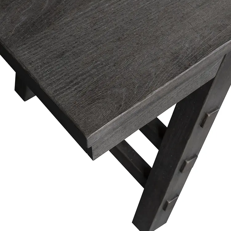 Crafted of poplar solids with knotty white oak veneers, the pieces feature a dusty charcoal finish with heavy distressing, accented by washed brass elongated bar pull hardware.