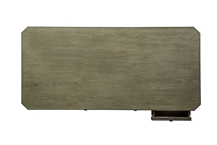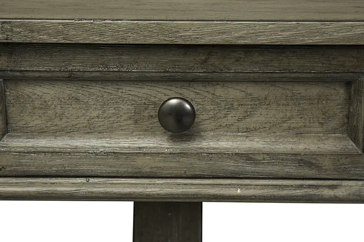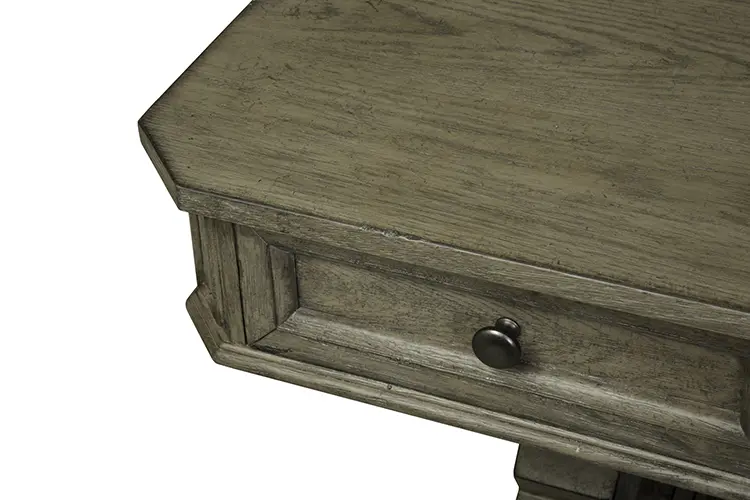 Crafted of rubberwood solids and cathedral white oak veneers, this piece features a heathered taupe finish and is accented with antique brass knob hardware.