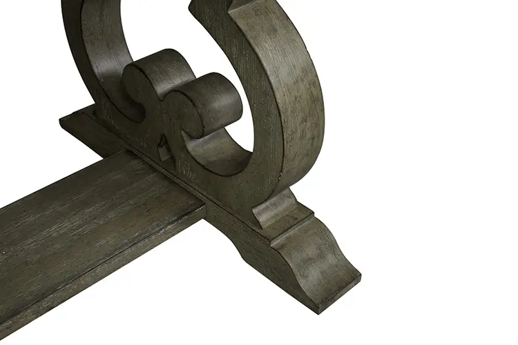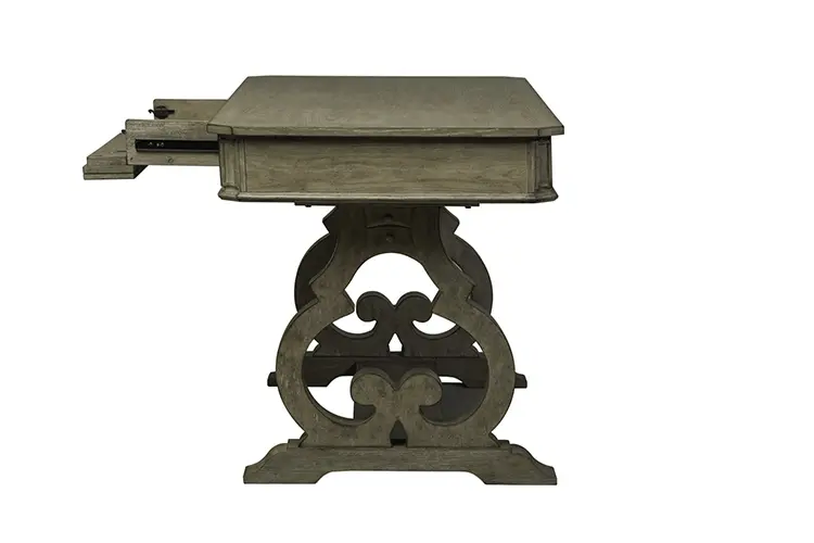 • Desk features three full extension wood framed drawers including a center drawer with a flip down keyboard tray, and is anchored by beautiful scrolled legs