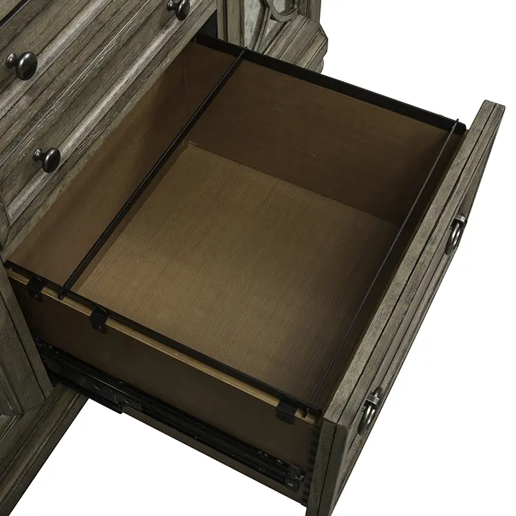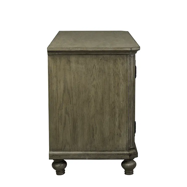 Crafted of rubberwood solids and cathedral white oak veneers, this set features a heathered taupe finish, full extension drawer glides for easy access to storage, fully stained interior drawers, canted corners with bead molding, a shaped grid overlay on the hutch end panels, and is accented by antique brass knob and drop ring pull hardware.