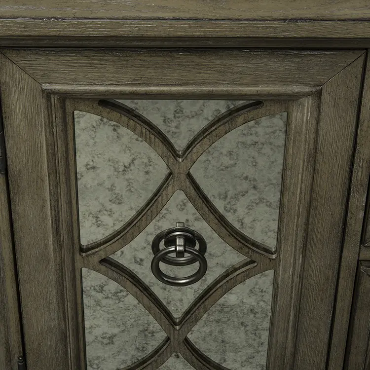 Crafted with rubberwood solids and cathedral white oak veneers, this piece features fully stained full extension drawers, canted corners with bead molding, antique mirrored doors with a decorative grid overlay, adjustable shelves, and wood framed drawer fronts.