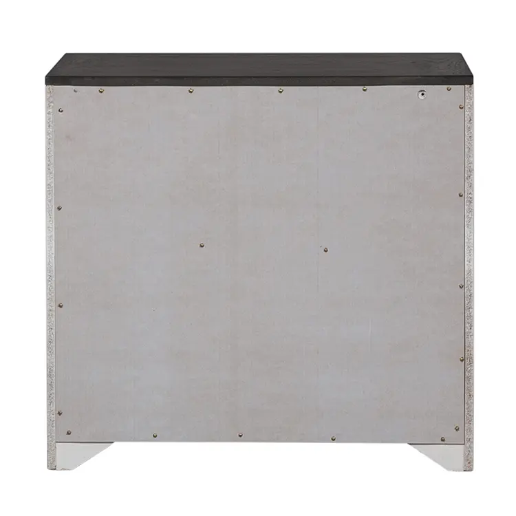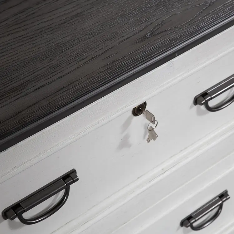 Crafted of pine solids with cathedral white oak tops and pine veneers, this piece features a wire brushed white finish with charcoal tops, full extension drawer glides on the two locking file drawers for easy access to storage, bottom case dustproofing to ensure longevity of contents, planked top, and is accented with antique pewter drop bail hardware.