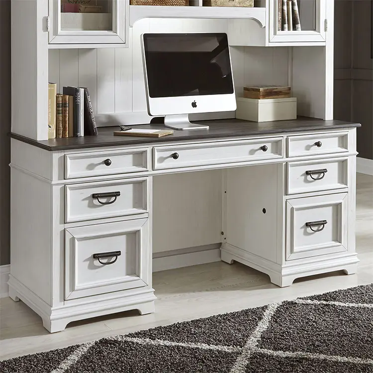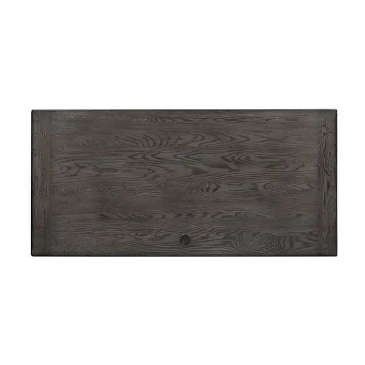Crafted with pine solids with cathedral white oak tops and pine veneer fronts, this piece features bottom case dust proofing, a wire brushed white finish with planked charcoal tops, and a flip down keyboard tray.