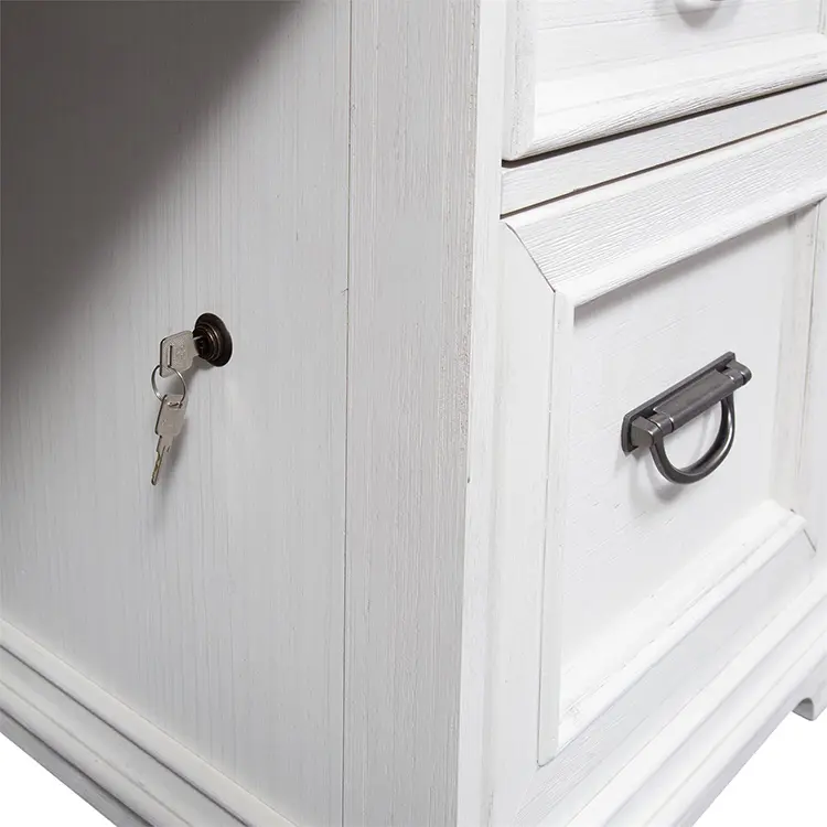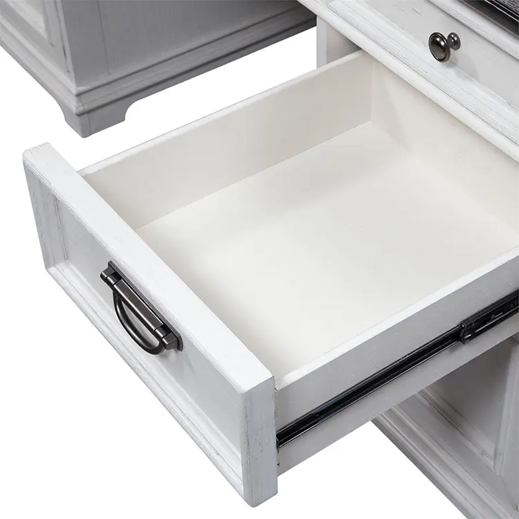 Storage abounds with the fully stained full extension drawers and the lockable file drawer.