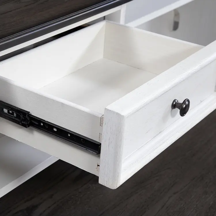 Full extension drawer glides for easy access to storage, one locking file drawer, bottom case dust proofing to ensure the longevity of contents, flip down keyboard tray for user convenience.