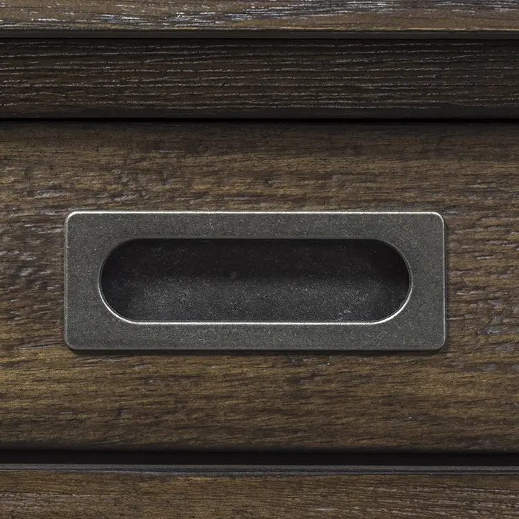 Crafted of acacia and rubberwood solids with white oak veneers, this kit features a rustic saddle finish, full extension drawers, wire management provisions, and is accented with recessed pulls in an antique pewter finish.