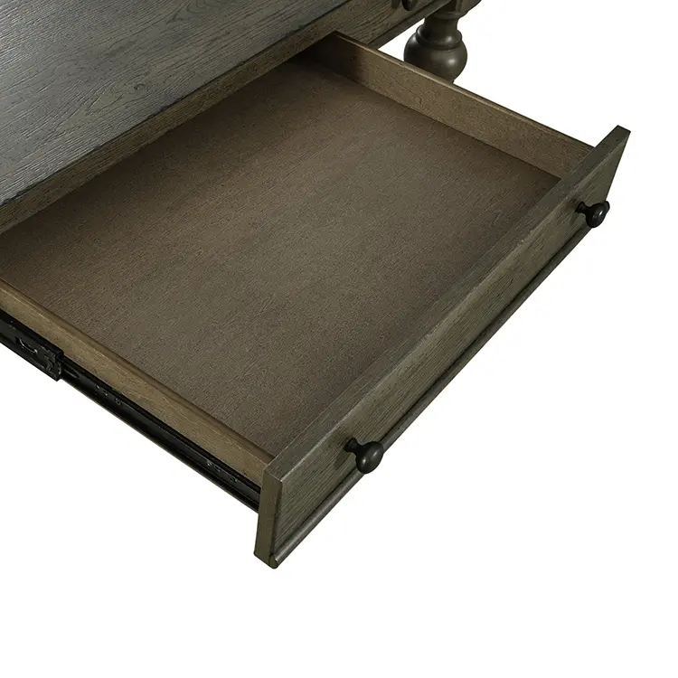 The file storage drawers are wood framed and are accented by Antique Brass drop ring hardware.