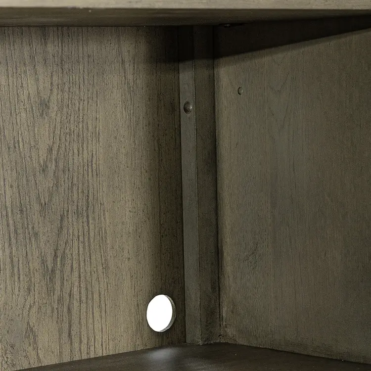 Crafted of poplar solids with white oak veneers, this set features a wire brushed dusty taupe finish with worm hole distressing and is accented with antique brass drop ring and knob hardware.
