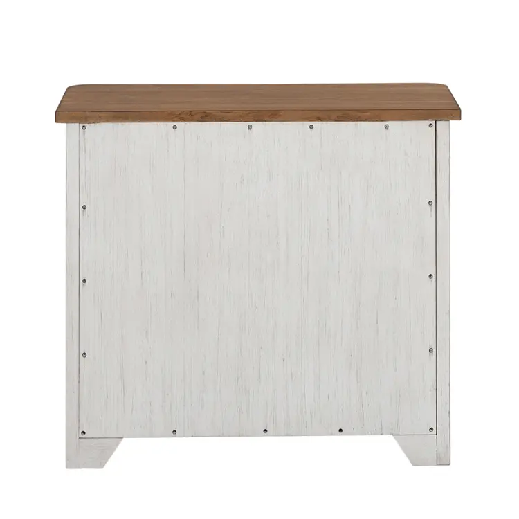 Crafted of pine solids with hickory and pine veneers, this piece features a two toned antique white finish with chestnut tops, heavy distressing, and is accented by antique brass knob hardware.