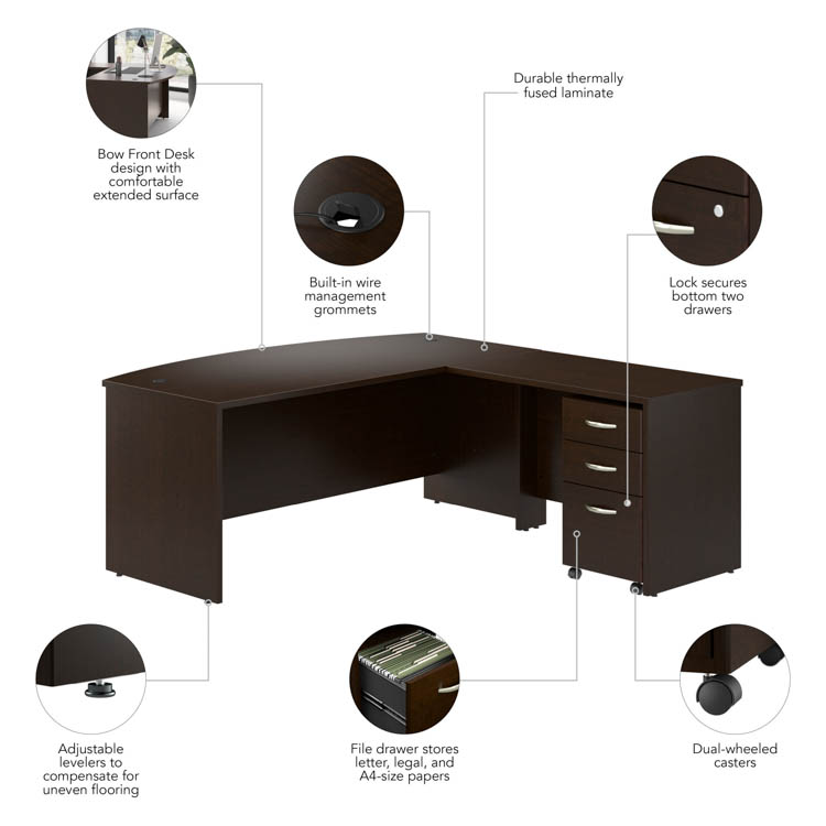 The Bush Business Furniture Series C 72" W Bow Front L-Shaped Desk with 42" W Return and Mobile File Cabinet offers a commercial quality workspace solution with the style and functionality today's professionals demand.
