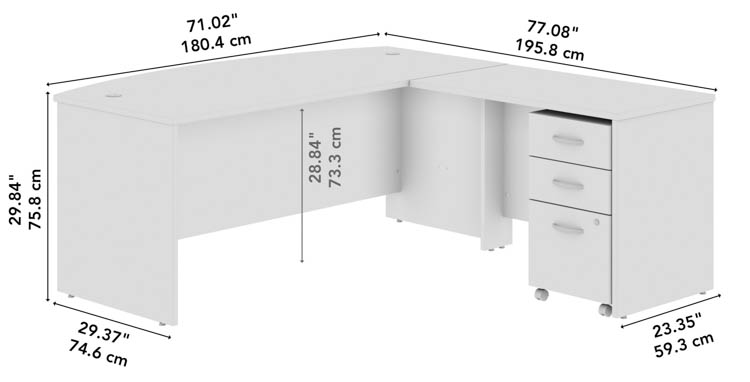 • Bundle includes: 72" W x 36" D Bow Front Desk, 42" W Desk Return, 3 Drawer Mobile File Cabinet