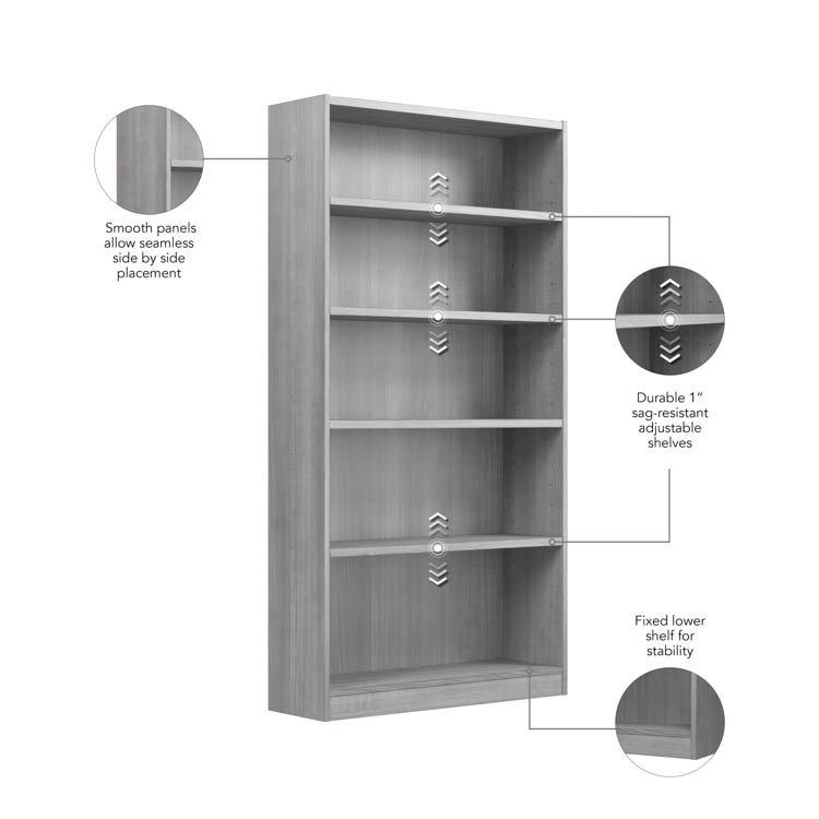 The Bush Furniture Universal Tall 5 Shelf Bookcase provides a versatile organization solution that makes it easy to show off your personal library or brighten up the room with pictures and decorations.