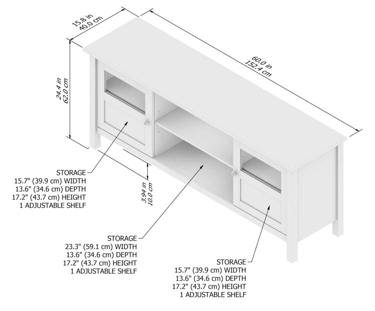 TV Stand features 3 adjustable shelves that support up to 25 lbs. each, as well as 2 doors that open and close on smooth self-closing, Euro-style hinges.