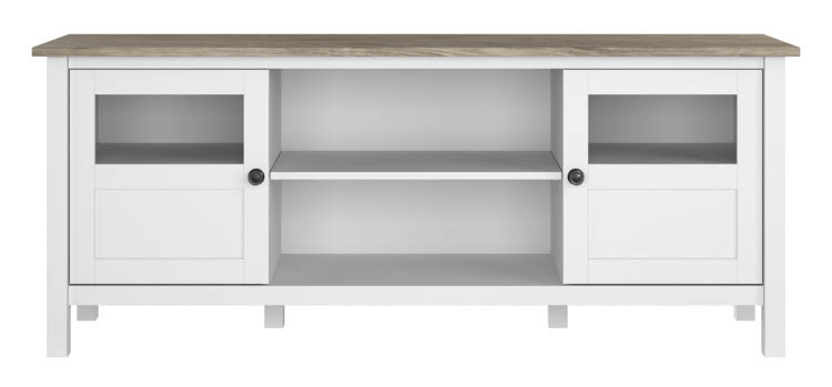 The media console accommodates televisions up to 65 in. and/or 55 lbs. to serve as an entertainment center or TV stand.