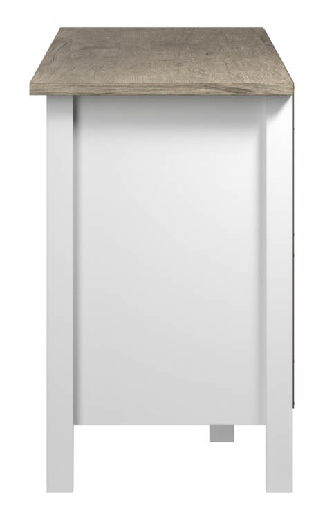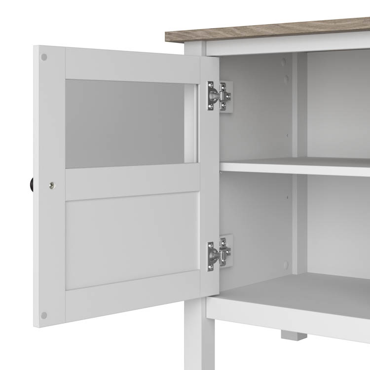 Modern farmhouse cabinet features a stylish two-tone finish with Dark Bronze Hardware, while the sturdy and attractive post leg design withstands years of use in virtually any residential setting.