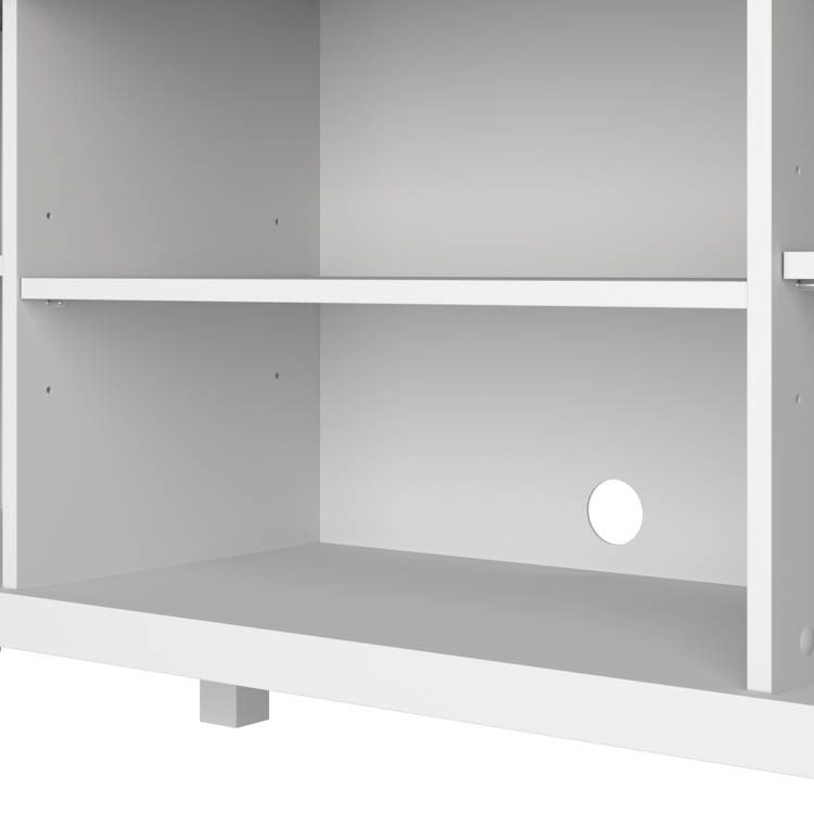 • Slide the middle adjustable shelf to feed cords down to the built-in wire management punchout, keeping your space tidy and cable-free
