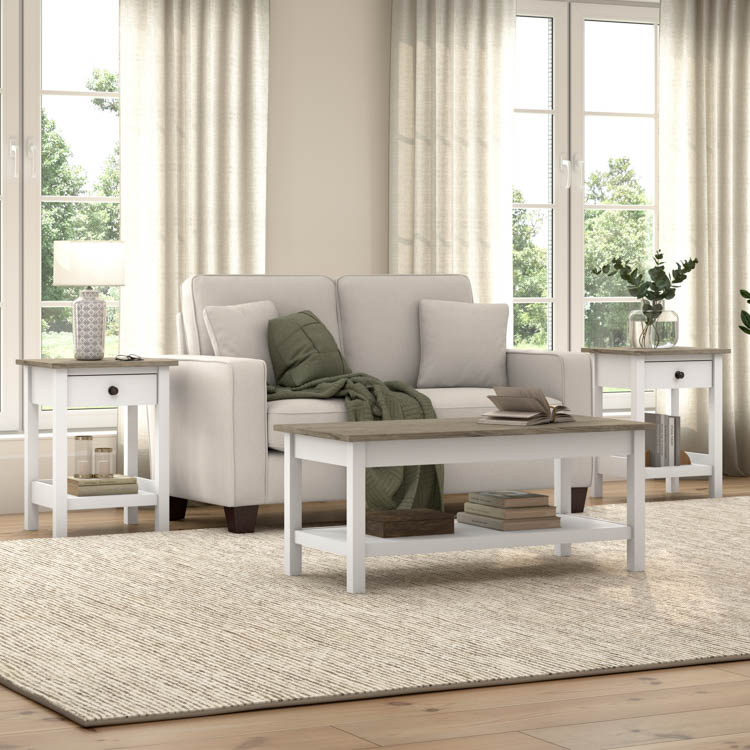 The Bush Furniture Mayfield Coffee Table with End Tables is a great way to organize any room or living space while invoking the cozy, welcoming charm of modern farmhouse styling.
