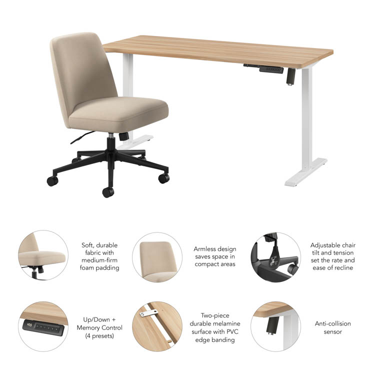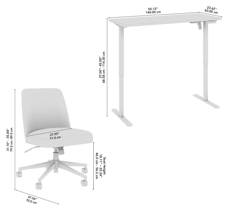 • Bundle includes: 55" W x 24" D Electric Height Adjustable Standing Desk, Mid Back Armless Office Chair