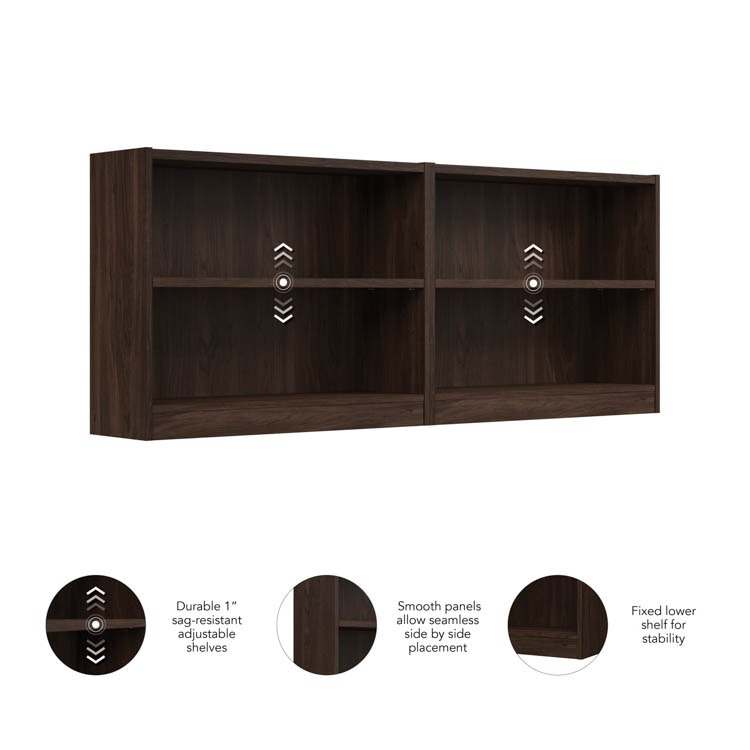 The Bush Furniture Universal Small 2 Shelf Bookcase Set of 2 provides a versatile organization solution that makes it easy to show off your personal library or brighten up the room with pictures and decorations.