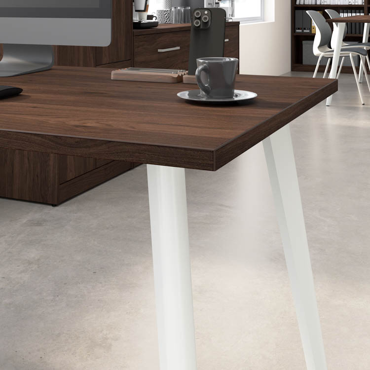 • Desk's splayed metal legs offer a sleek look with built-in cable management, allowing cords to route through any leg to the floor for a clutter-free space
