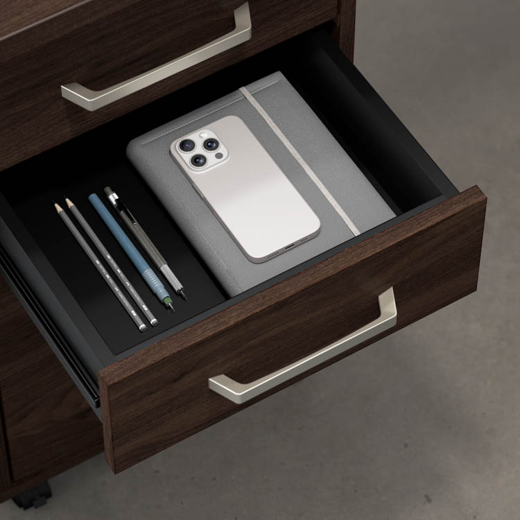 • Cabinet doors feature smooth self-closing, Euro-style hinges for an effortless open and close, while drawers open on smooth full-extension ball bearing slides for an easy reach to office items and files