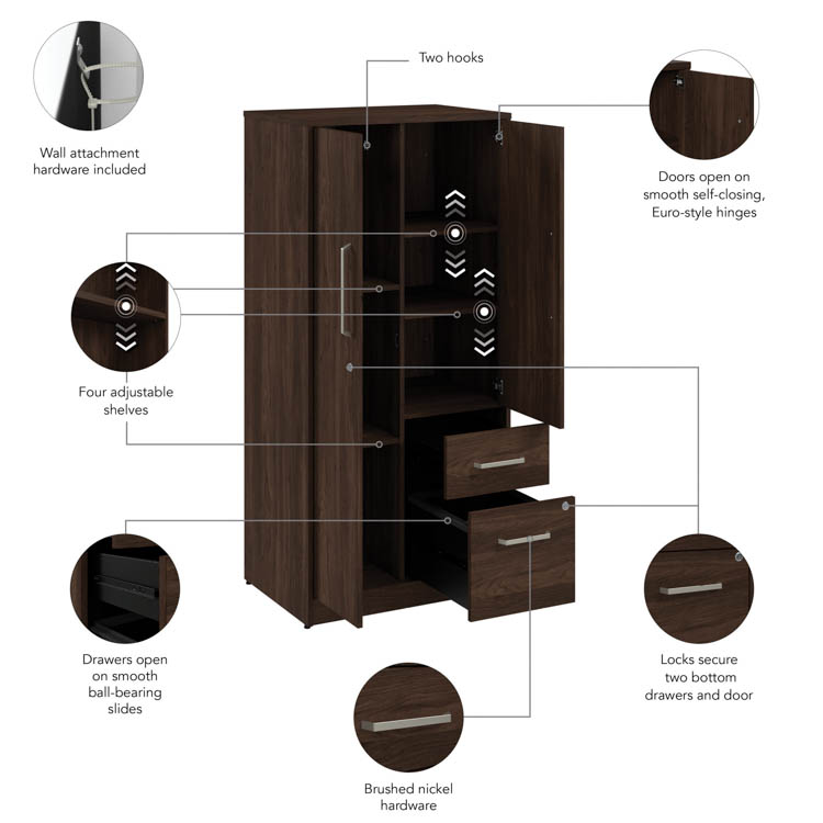 The Bush Business Furniture Vista Wardrobe Cabinet with Drawers keeps any office or workspace organized and clutter-free, adding a modern touch and extra storage where it's needed.