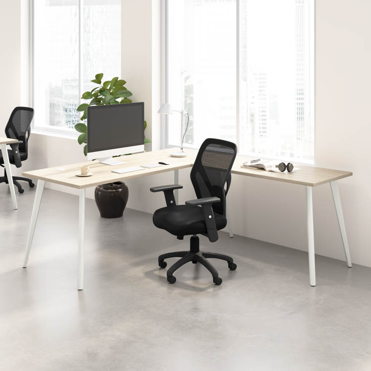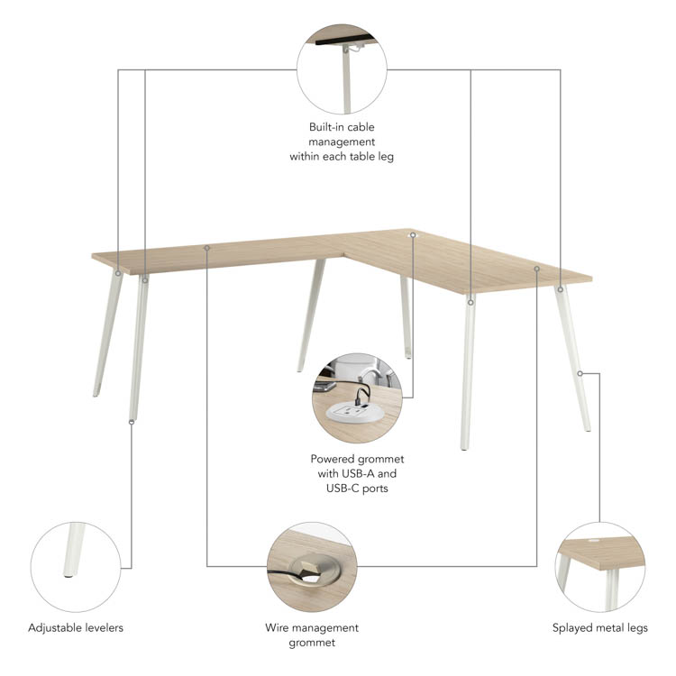 • Splayed metal legs offer a sleek look with built-in cable management, allowing cords to route through any leg to the floor for a clutter-free space
