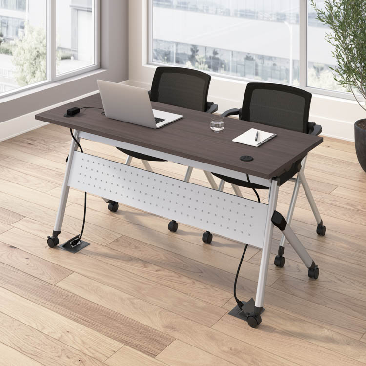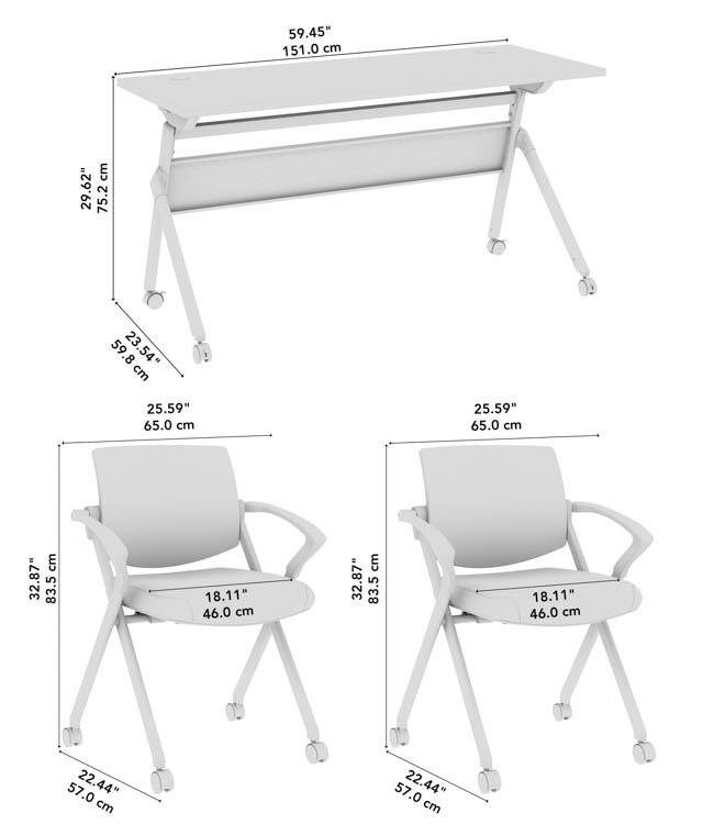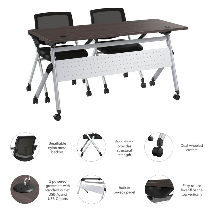 • Bundle includes: 60" W Folding Training Table, Mesh Back Folding Chairs with Arms - Set of 2, 2-inch Desktop Power Grommet with AC Outlet and USB-A/USB-C Ports - Set of 2