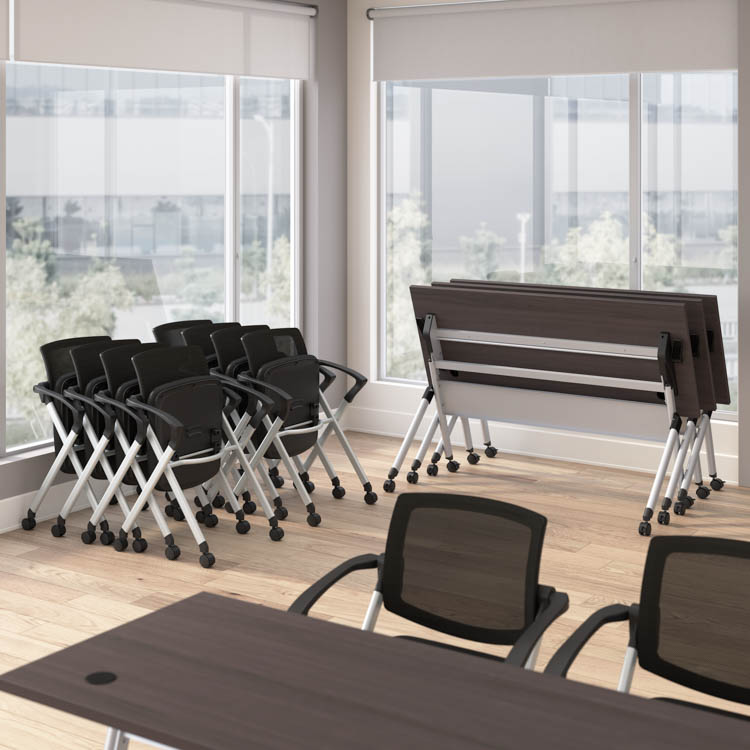 Easy-to-use lever flips the top vertically, allowing multiple folding tables to nest together, while the folding chairs are designed to be stacked in rows for convenient storage when not in use.