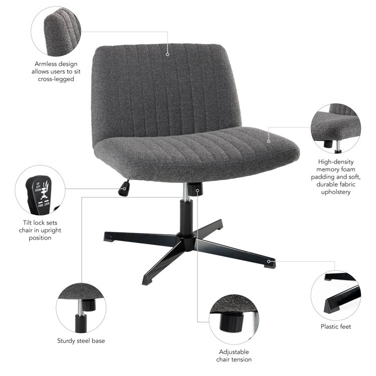 The desk chair's armless design gives users the freedom to sit cross-legged comfortably on a seat and backrest with high-density memory foam padding and soft fabric upholstery.