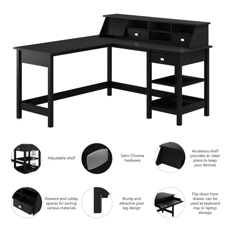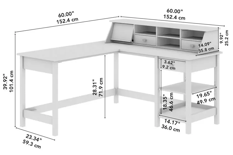 Two shelves and a small box drawer on the right side of the L-Desk ensure that papers, writing utensils, notebooks and other office supplies stay within reach as you get to work on your next project or assignment.