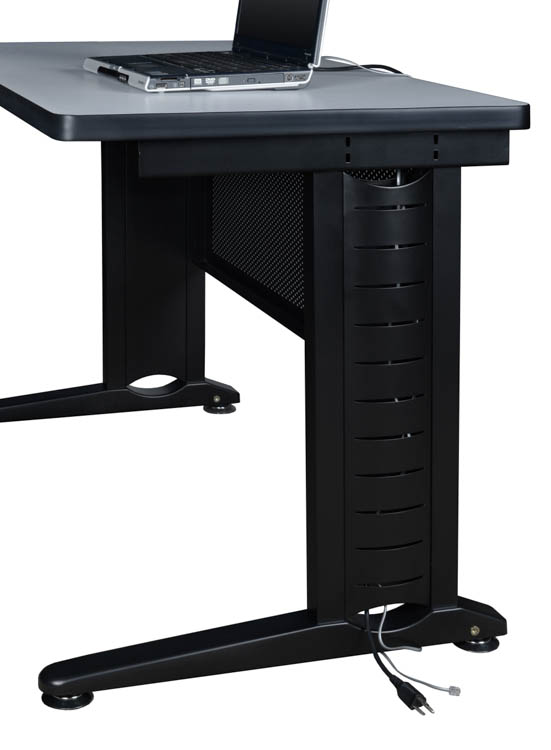 Wires run from a power source on the floor through the legs and cabling cutouts in the modesty panel and up to desktops for instant connectivity.