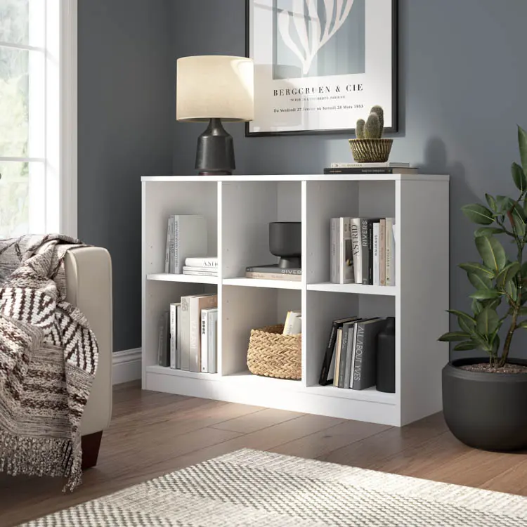The Bush Furniture Universal 6 Cube Organizer Shelf provides a versatile storage and display solution that makes it easy to show off your personal library or brighten up the room with pictures and decorations.