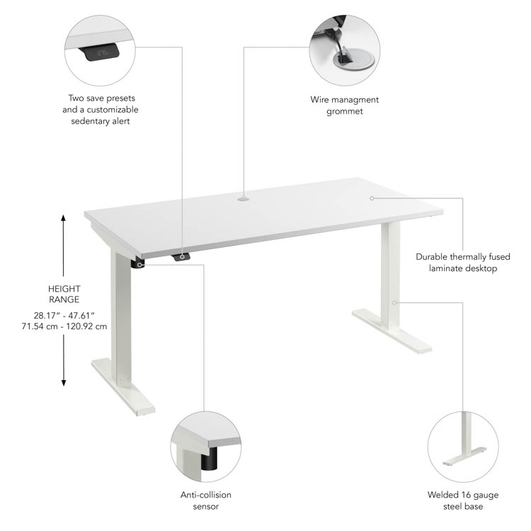 • Height Adjustable Standing Desk includes a motorized base and 60" W x 30" D top surface with built-in wire management