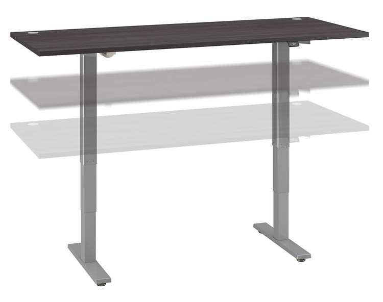 Three stage units lift the 72" W x 30" D desktop anywhere from 28 to 48" from the floor at a speed of 1.25" per second.