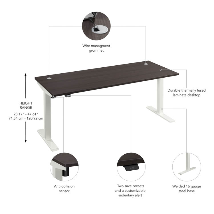 • Electric Height Adjustable Standing Desk includes a motorized base and 72" W x 30" D top surface with built-in wire management