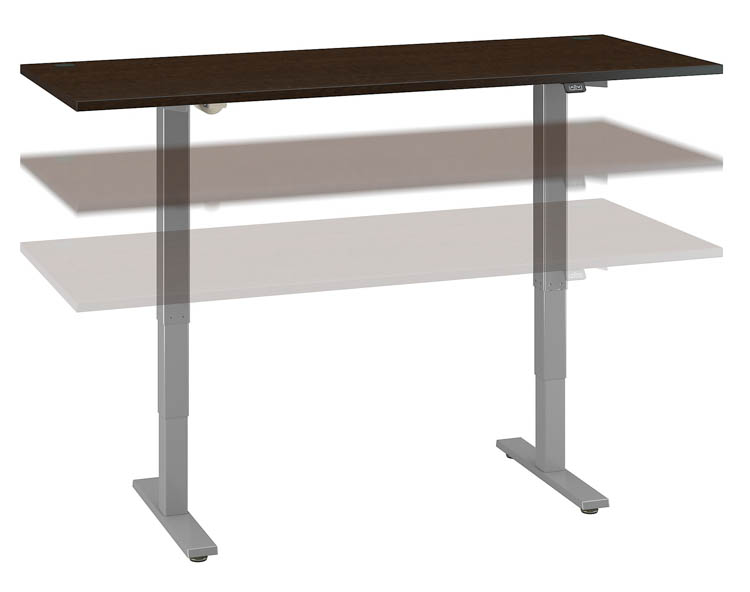 Three stage units lift the 72" W x 30" D desktop anywhere from 28 to 48" from the floor at a speed of 1.25" per second.
