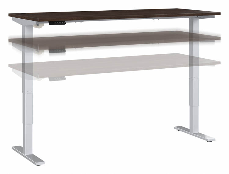 Three stage units lift the 72" W x 30" D desktop anywhere from 28 to 48" from the floor at a speed of 1.25" per second.