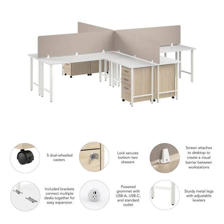 • Bundle Includes: 72-inch Computer Desk (4), 42-inch Desk Return (4), 3 Drawer Mobile File Cabinet (4), Desktop Privacy Screen (4), Desktop Power Grommet with AC Outlet and USB-A/USB-C Ports (4)