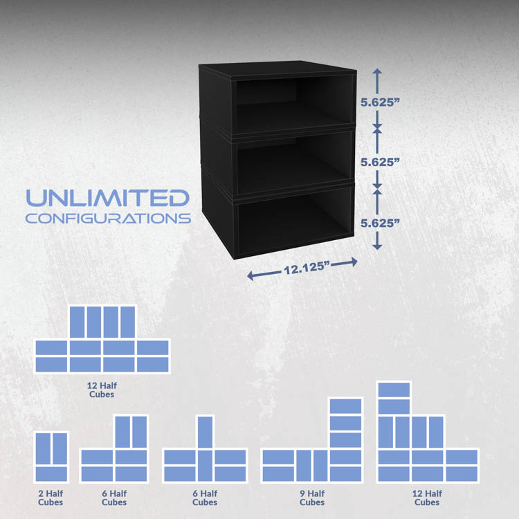 • Set of 3 half size storage cubes are designed to fasten together in any direction, in a row, in a pyramid, in a U or L shape or countless other configurations