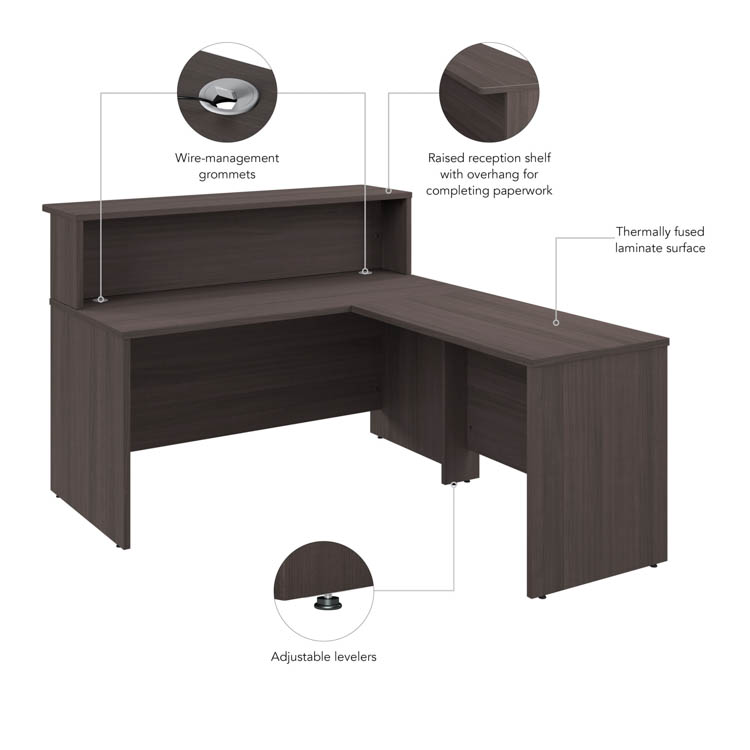 The Bush Business Furniture Arrive 60"W x 72"D L-Shaped Reception Desk with Shelf provides a stylish and practical solution for welcoming guests to your office's waiting room.