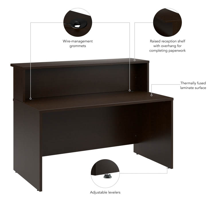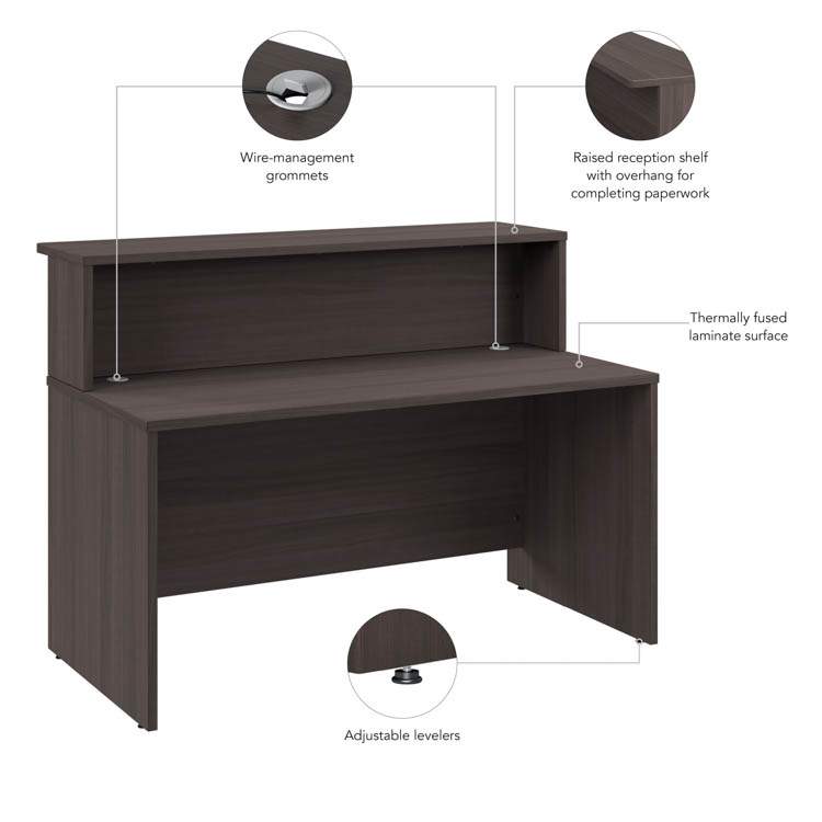 The Bush Business Furniture Arrive 60"W x 30"D Reception Desk with Shelf provides a stylish and practical solution for welcoming guests to your office's waiting room.